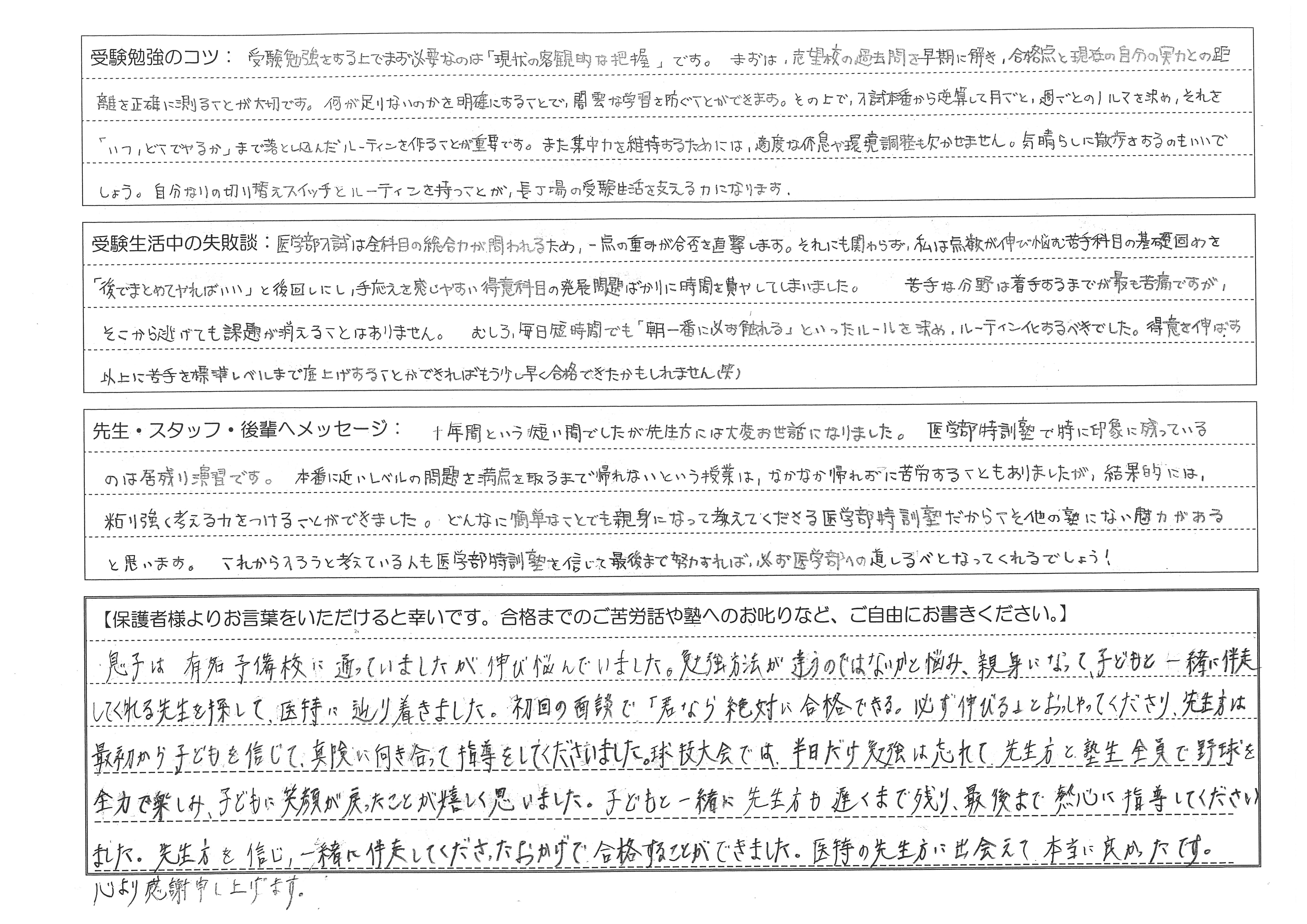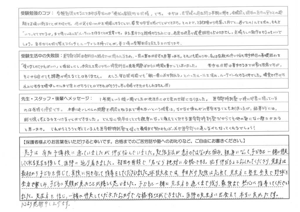 息子は、有名予備校に通っていましたが長く伸び悩んでいました。勉強方法が違うのではないかと悩み、親身になって子どもと一緒に伴走してくれる先生を探して、医特に辿りつきました。初回の面談で「君ならぜっていに合格できる。必ず伸びる」と仰ってくださり、先生方は最初から子どもを信じて、真剣に向き合って指導してくださいました。球技大会では半日だけ勉強を忘れて、先生方・塾生全員と野球を全力で楽しみ、子どもに笑顔が戻ったことが嬉しく思いました。子どもと一緒に先生方も遅くまで残り、最後まで熱心に指導してくださいました。本当にありがとうございました。先生方を信じ、一緒に伴走してくださったおかげで合格することができました。医特の先生方に出会えて本当に良かったです。心より感謝申し上げます。