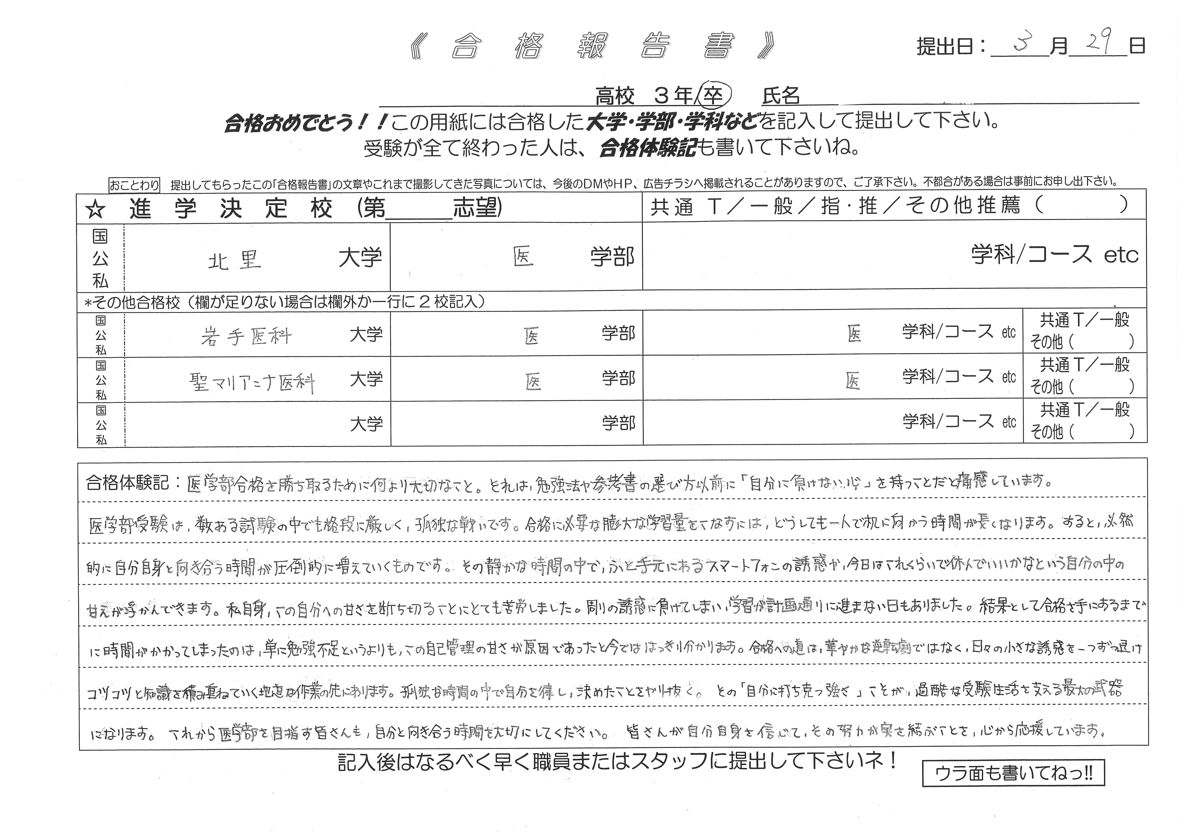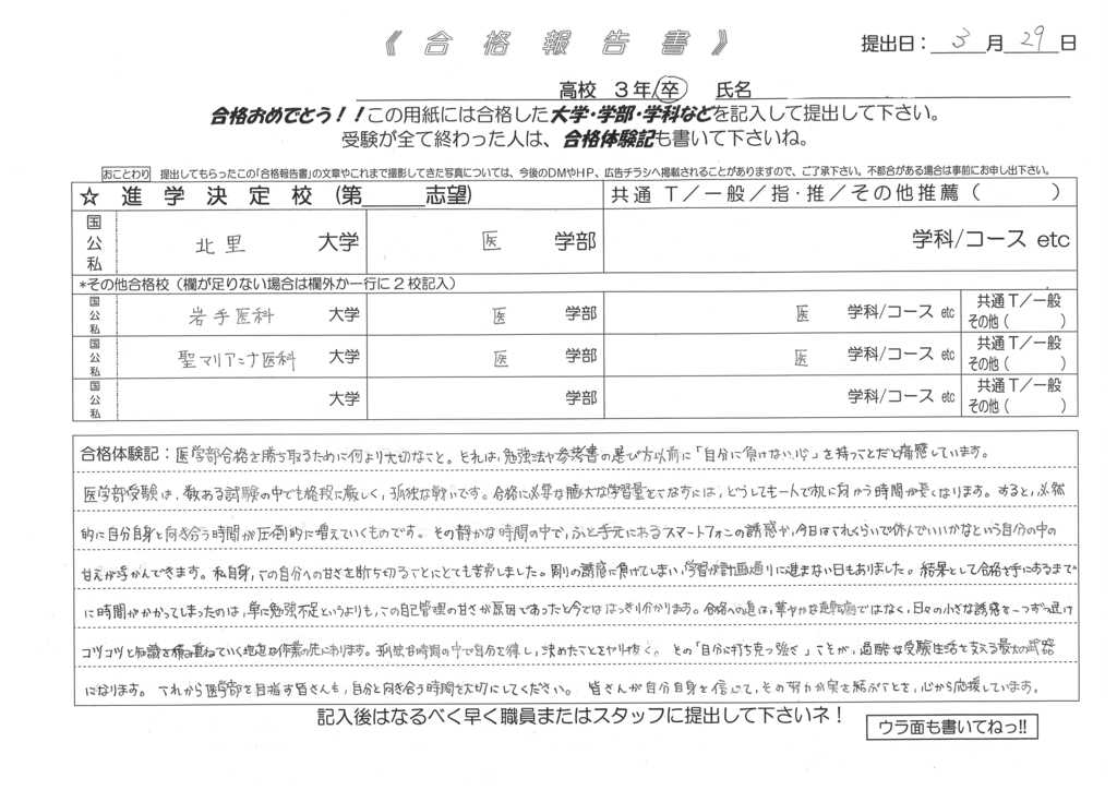 合格校:北里大学医学部(正規合格) 岩手医科大学(正規合格) 聖マリアンナ医科大学(補欠合格)