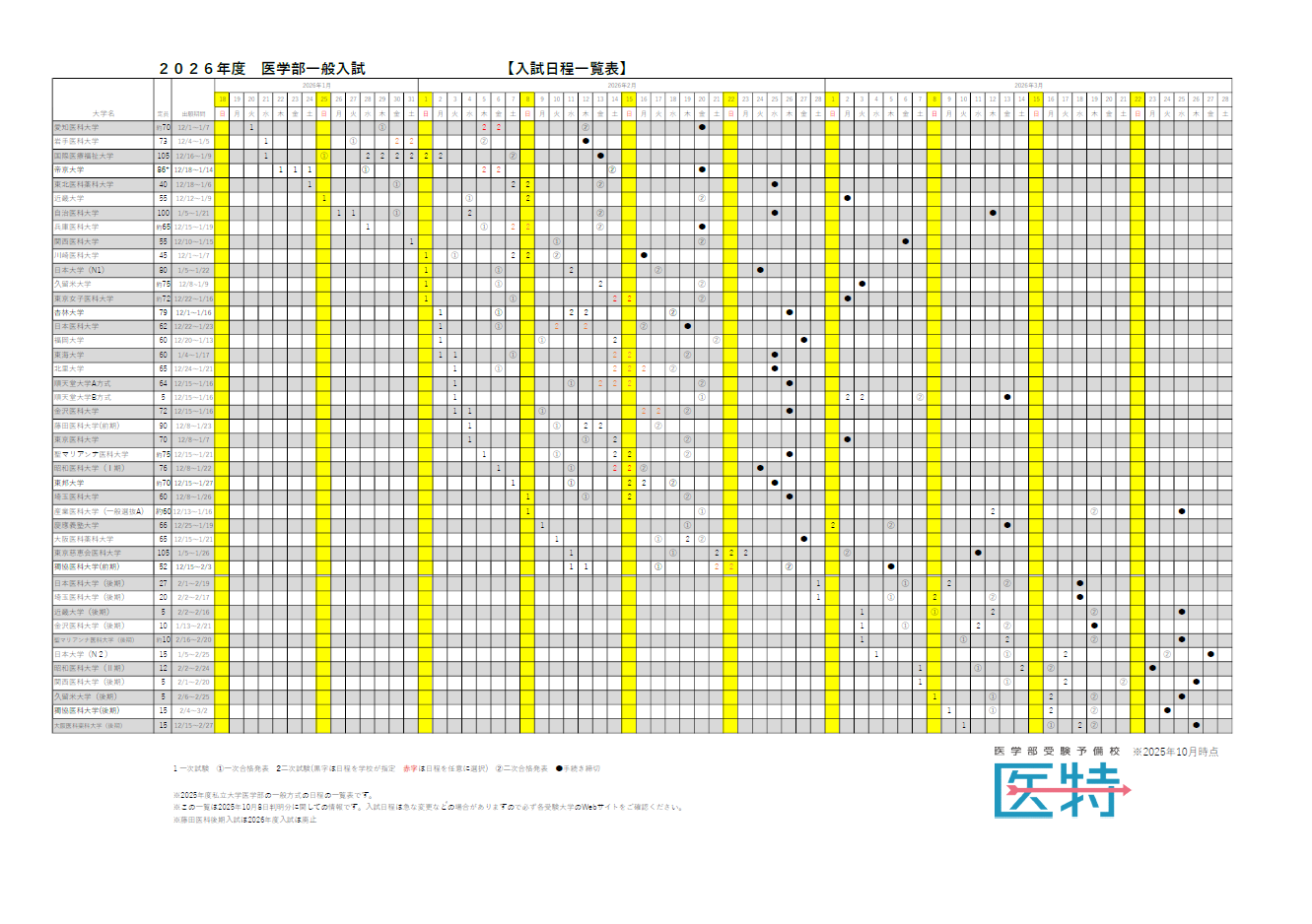 日本最速!?2026年度医学部一般入試 入試日程一覧表です。下の画像よりPDFがダウンロード頂けます。